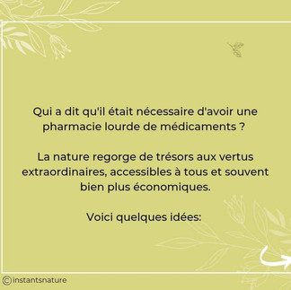 Parce que la nature regorge de trésors, je vous partage ci-après la trousse de secours d’ Instants Nature Aromathérapie et n’hésitez pas à commenter et partager vos propres expériences.